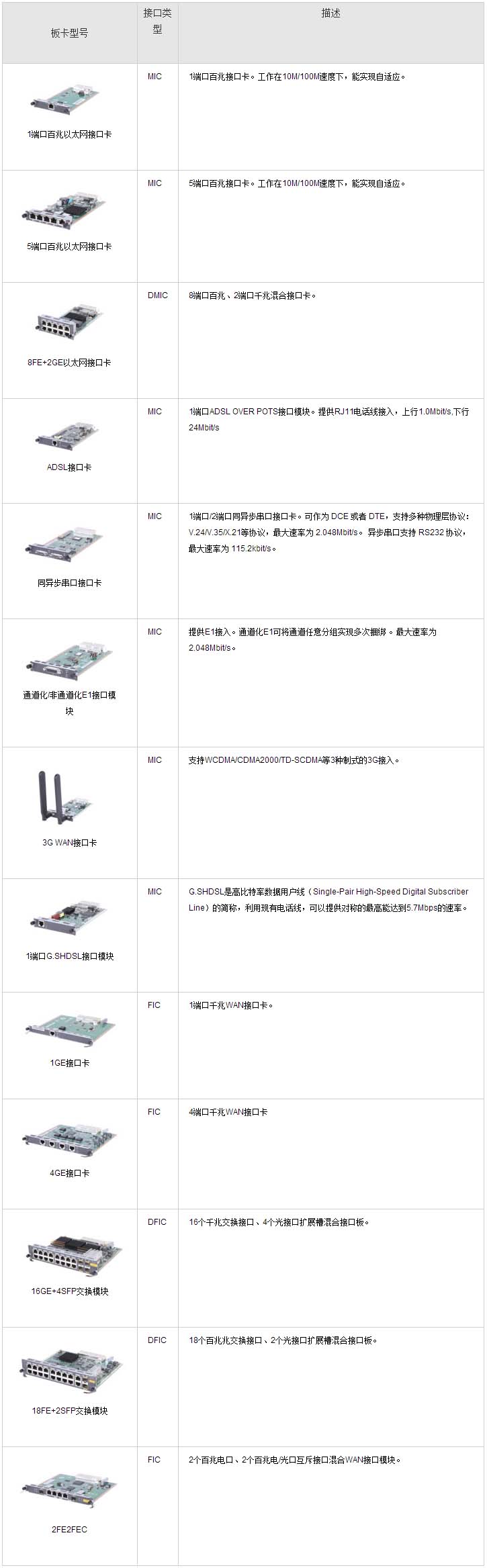 USG2200BSR支持多(duō)種接口卡,包括FE/GE/E1/CE1/ADSL/串口卡等,按使用槽位的不同,分為MIC、DMIC(雙MIC高(gāo))、FIC、DFIC卡(雙FIC高(gāo))。