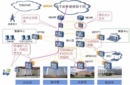 政務園區(qū)網絡解決方案通(tōng)過如下方案實現業務層的需求: